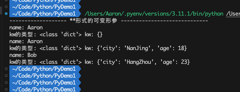 对于**形式的可变形参,其会收集未匹配的关键字实参 并以字典dict形式进行存储。形参名称习惯上使用kw