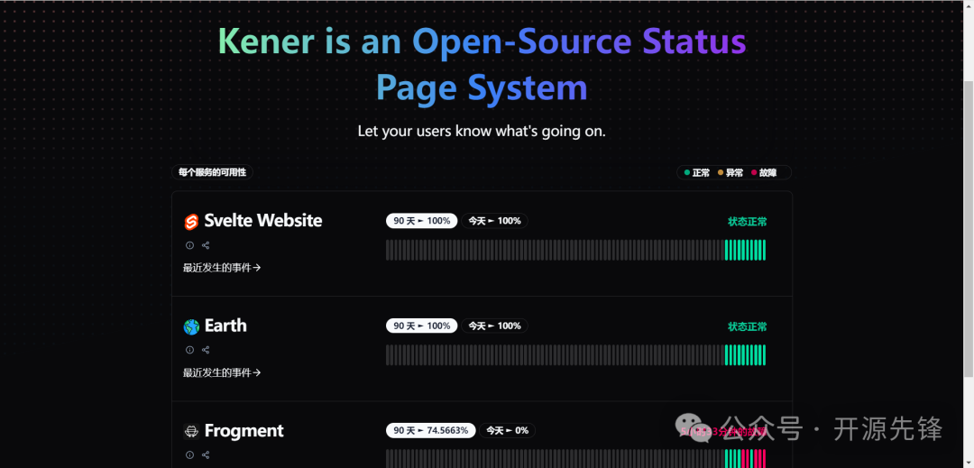 小结一下,Kener 是一个功能强大、易于使用且可扩展的状态页系统,它可以帮助我们轻松监控服务状态,高效管理突发事件,并供透明的服务状态信息。